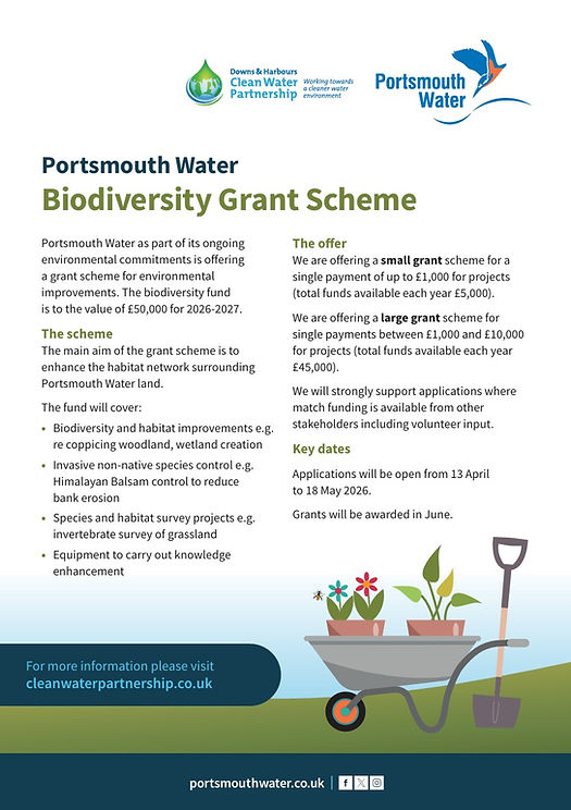 The application period for the 2026/27 grant scheme is NOW OPEN. We are currently accepting applications between 13th April - 18th May 2026. If you wish to apply, please email your application to catchment.management@portsmouthwater.co.uk